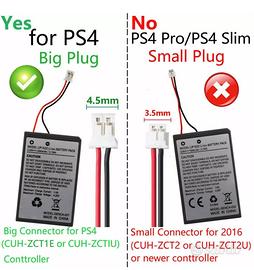 La batteria deve essere installata su controller CUH-ZCT1E o CUH-ZCTIU, perché il connettore è più grande (4,5mm) rispetto a quello dei controller CUH-ZCT2 e CUH-ZCT2U che è 3,5mm, questi ultimi appartengono alla PlayStation Pro o Slim.