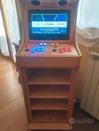 Vendo bellissimo cabinato arcade realizzato artigianalmente con struttura in legno massello, perfetto per arredare con stile una sala giochi, un ufficio o un salotto. A differenza dei classici cabinati da bar, questo pezzo vanta un design pulito ed elegante che si adatta a ogni ambiente. Design Unico: Struttura verticale autoportante in legno con ampi ripiani inferiori per esporre console, collezioni o accessori. Hardware & Software: Sistema configurato con interfaccia grafica moderna (EmulationStation/Retropie) che include emulatori per Amiga, Atari e molti altri classici. Pannello Comandi Doppio: Set completo per 2 giocatori con joystick a pomello arancio (Sfere del drago Dragonball) e tasti retroilluminati a LED (blu e rossi) per un'esperienza di gioco autentica. Audio Integrato: Sistema a due casse posizionate nella parte superiore per un suono stereo coinvolgente. Display: Monitor LCD ad alta definizione con ottima resa cromatica.
