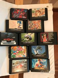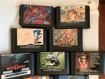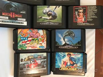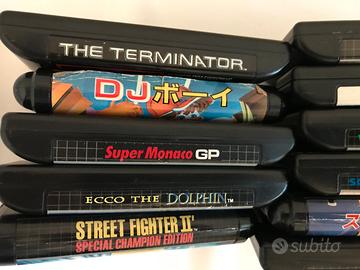 N. 11 cartucce per console Sega Mega Drive: 1) Sonic the hedgehog – 2) Super Monaco GP – 3) The Terminator – 4) Ecco the Dolphin – 5) Golden Axe - 6) DJ Boy – 7) Street Fighter 2 Special Champion Edition – 8) Alex Kidd – 9) World Cup Italia 90 – 10) Mortal Kombat 2 – 11) Strider. Senza custodia e senza libretto istruzioni. 25 euro ogni cartuccia.