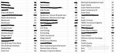 Offro tantissimi titolidella mitica SNES, console degli anni 90. Prezzi: vedi foto n3 Acquisto minimo: 5 giochi Pagamento: bonifico o paypal amici Spedizione a rischio dell'acquirente: 9€ Vendita privata