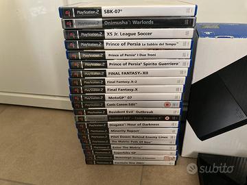 Console PlayStation 2 slim + 21 giochi tra cui grandi titoli come Canis Canem Edit e Resident Evil Code Veronica! La console è perfettamente funzionante ed é stata usata solo una volta. La console è completa di joystick (tasto start non funzionante probabile ossidazione interna), cavi e libretto. I titoli dei giochi sono i seguenti: Superbike Gp Disgagea (lingua inglese) Resident Evil Code Veronica (inglese) Pilot down: Behind enemy Lines Minority report (inglese) Formula One 2001 Motorsiege Enter The Matrix The Matrix path of neo Resident Evil Outbreak Canis Canem Edit MotoGP 07 Final Fantasy X Final Fantasy X 2 Final Fantasy XII Prince of Persia spirito guerriero Prince of Persia le sabbie del tempo Prince of Persia i due troni Xs jr League Soccer Onimusha warlords Sbk 07 Tutti funzionanti e completi di manuale