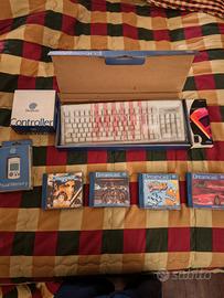 Oltre alla console sono presenti 2 controller,memory card e una tastiera nuova mai usata ufficiale.