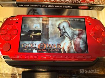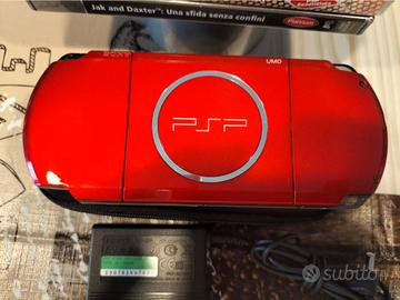 Console Sony PSP Playstation Portable 3004 di colore rosso, con alimentatore originale Sony, batteria commerciale. In buone condizioni generali, funzionante in tutte le sue parti, da segnalare solamene un rumore "metallico" interno che si presenta specialmente in fase di caricamento dati di gioco dal UMD (come se qualche parte metallica graffiasse sulla superficie del disco). Memory Stick Pro Duo da 4gb, custodia generica, panno in microfibra . Compresi nella vendita i 5 giochi in foto, tutti versione Pal Italia, completi dai rispettivi manuali, custodie integre e copertine, testati e funzionanti :