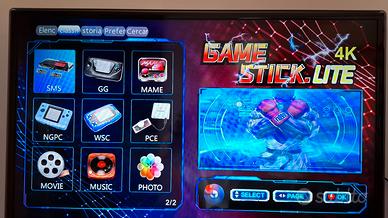 Console Stick , collegabile comodamente alla tv tramite presa HDMI , di piccole dimensioni , quindi facilmente trasportabile, con più di 20000 giochi arcade di varie piattaforme facilmente selezionabili. 2 Controller. Lingua Italiano. Nuovo in confezione originale.