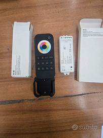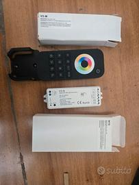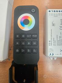 Controller per strisce LED RGB+CCT con telecomando. - Modello: V5-M - Input: 12-24VDC - Output: 5x(12-24)VDC - Corrente massima: 15.5A - Potenza massima: 5x(36-72)W - Controllo wireless 2.4G