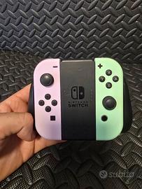Coppia di Joycon sia Destro DX che sinistro SX per console Nintendo Switch originali NINTENDO. + Grip nero sempre originale per attaccare i due controller e farlo diventare tipo joystick. Colore joycon viola chiaro e verde acqua. In perfette condizioni generali e perfettamente funzionanti,come nuovi. Non ci sono i laccetti con le plastiche laterali dei Joycon. Come da foto. Pad,Gamepad.