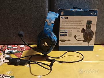 Cuffie con microfono da gaming della Trust GXT 488 Forze-B con design over-ear colore blu mimetico usate per Ps4 ma usate anche su Ps5. Presenti leggeri segni di usura (foto) sui padiglioni auricolari e nella parte morbida sulla testa. Vendo per regalo cuffie originali Ps5.