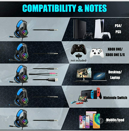 Compatibilità multipiattaforma: queste cuffie da gioco con una presa audio da 3,5 mm sono compatibili con PS4, PS5, PC, Xbox One, Xbox One S/X, computer portatili, Mac, tablet, telefoni. Quando si collega alla PS4/PS5 non è necessaria alcuna configurazione, basta collegare e il gioco è fatto. Il jack USB alimenta solo le luci RGBcon la corrente.