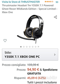 Cuffie per videogiochi Thrustmaster Y-350 x 7.1 Powered Ghost Recon Wildlands Edition: realizzate in partnership mondiale con l'emblematica licenza targata 'Ghost Recon', queste cuffie per videogiochi, accompagnate da licenza ufficiale, offrono il suono perfetto su Xbox One e PC Windows 10 essendo dotate di potenti diffusori di alta qualità da 60 mm. Plug n' Play su Xbox One e PC Windows 10. Accetto paypal