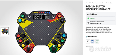 Usato solo due volte. Vendo per inutilizzo. Unico proprietario adulto (36 anni), ambiente non fumatori, tenuti maniacalmente, mai caduti. * Fanatec Clubsport Wheel Rim 320 €149.95 EUR * Podium Button Module Endurance €219.95 EUR * Basic Paddle Module (del V2.5 X) con paletta grande (del Podium Advanced Paddle Module) * Podium Hub €184.95 EUR * QR2 Wheel-Side €99.95 * Button Caps And Sticker Set €39.95 EUR * Supporto da Parete per Volante Fanatec QR2 €5.95 EUR