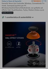 vendo controller Gamesir Nova Lite colore space purple, nuovo in confezione originale possibilità di vendita di una coppia a 45 euro Il controller di gioco wireless GameSir T4 Nova Lite è compatibile con Windows 10/11, Switch, Android, iOS e Steam Deck. (Dongle 2.4G e cavo USB sono inclusi). I joystick GameSir Hall Effect sono specifici per le prestazioni dei joystick No Dead Zone e No Drifting. Il controller per PC T4 Nova Lite offre la stessa esperienza precisa e coinvolgente con trigger lineari del popolare controller PS5, migliorando il divertimento del gioco. Goditi una flessibilità senza pari con tre opzioni di connettività: Bluetooth, dongle wireless 2.4G e USB-C. Passa da un dispositivo all'altro senza sforzo per un'esperienza di gioco senza problemi. Il controller Bluetooth è dotato di una funzione Turbo a 20 Hz con pulsanti personalizzabili, inclusi A/B/X/Y/LB/LT/RB/RT. I giocatori possono facilmente attivare o disattivare la funzione Turbo premendo il pulsante M, fornendo un modo conveniente per migliorare il gameplay. Libera le dita e immergiti completamente nell'esperienza di gioco. Batteria integrata da 600 mAh del controller Bluetooth T4 Nova Lite, dura fino a 10 ore di riproduzione quando è completamente carica in 2 ore. Pulsante M multifunzione per un controllo conveniente: regola facilmente varie impostazioni con il pulsante M multifunzione, dall'intensità delle vibrazioni, al layout ABXY alla zona morta degli stick. joystick joypad gamepad