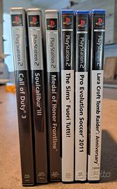 Vendo NON separatamente n. 6 giochi originali per console PS2, nelle confezioni originali con i relativi libretti di istruzioni + 3 schede di memoria da 8 MB ciascuna. Call of Duty 3, PES 2011, Lara Croft Tomb Raider: Anniversary, Soulcalibury 3, The Sims fuori tutti, Medal of Honor frontline. In caso di spedizione aggiungere spese postali secondo modalità prescelta.