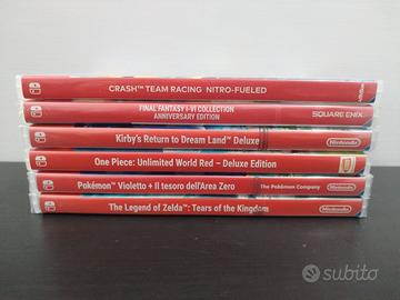 Vendo i seguenti giochi per Nintendo Switch 1 (e compatibili anche con Nintendo Switch 2) Se interessati contattatemi al 328 0378236(ok anche whatsapp) Ritiro possibile in zona Mezzocammino / Spinaceto. A richiesta posso spedire in tutta Italia con costi a carico dell'acquirente. - Crash bandicoot CTR Nitro fueled ................ 15 euro - Final Fantasy I-VI collection(NUOVO SIGILLATO)... NON DISP. - Kirby's return to dreamland(NUOVO SIGILLATO) ... NON DISP. - One Piece: Unlimited world Red-Deluxe edition ... 30 euro - Pokemon violetto + Il tesoro dell'area zero(NUOVO SIGILLATO) ... 110 euro - Zelda Tears of the kingdom(NUOVO SIGILLATO)..... 45 euro Tutto in perfette condizioni, versioni italiane (triangolo blu).