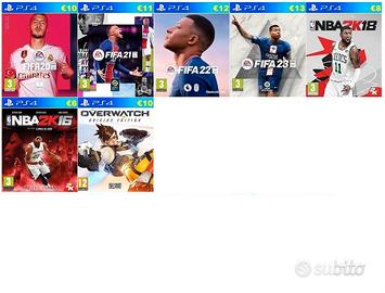 Vendo 22 Giochi PS4 i prezzi sono scritti in GIALLO sopra ogni cover €20 RED DEAD REDEMPTION 2 €20 CALL OF DUTY BLACK OPS COLD WAR €20 CRASH N'SANE TRILOGY €15 BLOODBORNE €15 GOD OF WAR €15 ASSASSIN'S CREED ORIGINS €15 METRO REDUX €15 INJUSTICE 2 €15 ACE COMBAT 7 SKIES UNKNOWN €15 ONE PIECE PIRATE WARRIORS 3 €15 WATHCH DOGS 2 €15 MAFIA 3 €15 THE ORDER 1886 €10 RATCHET E CLANK €15 THE DIVISION 2 €10 FIFA 20 €11 FIFA 21 €12 FIFA 22 €13 FIFA 23 € 8 NBA2K18 € 6 NBA2K16 €10 OVERWATCH ORIGINS EDITION