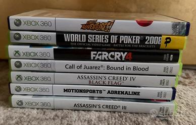 7 giochi xbox360 1.Assassin's Creed III 2.Assassin's Creed IV: Black Flag 3.Far Cry 4 (Limited Edition) 4.Call of Juarez: Bound in Blood 5.World Series of Poker 2008 6.Kinect Adventures! (Richiede sensore Kinect) 7.Motionsports Adrenaline (Richiede sensore Kinect)
