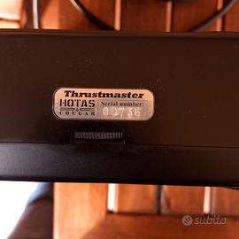 Thrustmaster HOTAS Cougar serial number 736 + mod "Evenstrain" serial 57. La mod hardware Evenstrain rimpiazza completamente il meccanismo interno del joystick e adotta sensori Hall - descrizione completa sul sito Flyfoxy (dot) com. Il sistema è funzionante, recentemente testato, anche se non in uso da diversi anni. Tutt'al più si dovrà spruzzare del contact cleaner sui potenziometri. Il Joystick ha sviluppato un po' di gioco centrale su entrambi gli assi, come molti Cougar. La vernice sul joystick è venuta via (vedi foto) dopo anni di uso intensivo, anche se con dei guanti. Vero effetto vintage assicurato! Manuali - anche ITA - e software si trovano sul sito Flyfoxy (dot) com Unico proprietario (verificabile su Cougar (dot) Flyfoxy (dot) com (slash) cougarowners.php) Con scatola originale e cover protettive su misura, ricamate col mio callsign dell'epoca ("Ripley"). Ritiro a Roma, zona Baldo degli Ubaldi.