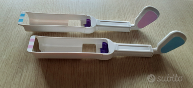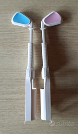 Vendo un kit completo di accessori per miniWii. Si tratta degli accessori per i joypads della console miniWii, con la coppia di mazze da golf (che possono diventare le racchette da tennis) e i volanti da auto. Ovviamente usati dai bimbi, quindi per non far litigare nessuno, nella cromia azzurro&rosa. Usati poco e ben tenuti. Rendono più realistico il gioco del golf, del tennis (facendo attenzione che non se le stampassero vicendevolmente in faccia.. ) e di guida auto.. Prezzo anche leggermente trattabile..