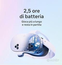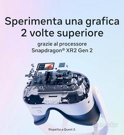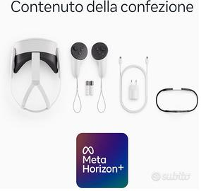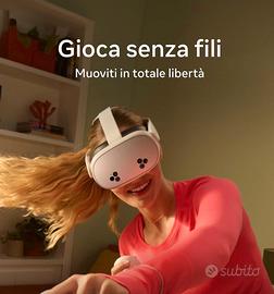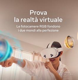 Scopri la magia di Meta Quest 3S e goditi le tue app preferite in un modo del tutto nuovo. Mescolando i contenuti digitali con l’ambiente fisico, hai accesso a infinite possibilità. Guarda film e altri programmi su uno schermo dai colori vivi che trasforma la tua casa in un vero cinema. Dai vita ai giochi nel tuo salotto, trasformati nel tuo giocatore preferito ed entra direttamente nel vivo dell’azione. Passa il tempo con gli amici a distanza come se foste nello stesso luogo, guardando un concerto insieme o incontrandovi in Meta Horizon. Leggero e senza fili, Quest 3S ti consente di allenarti in modi incredibili, divertendoti mentre ti mantieni in forma. Vivi l’incredibile a un prezzo incredibile. Come pensi di iniziare? Funzionalità e dettagli Scopri migliaia di esperienze immersive. Con la realtà virtuale, puoi aumentare il livello di immersione mentre ti diverti con i tuoi giochi preferiti, ti godi il tuo cinema privato e molto altro ancora. Vivi l’esperienza di gioco definitiva e goditi i tuoi titoli Xbox preferiti su un mega schermo virtuale da 312 pollici. In più, ottieni 3 mesi di prova di Meta Horizon+ e approfitta di un catalogo di fantastici titoli in continuo aggiornamento. Divertiti ancora di più con i tuoi amici con Quest. Immergiti in un gioco coinvolgente con persone di tutto il mondo, guarda un concerto dal vivo insieme a loro in Meta Horizon o invita tutti a guardare mentre giochi sul tuo televisore. Trasforma ogni stanza nel tuo cinema personale. Oscura lo spazio intorno a te e goditi lo spettacolo su uno schermo gigante dai colori vividi. Sfrutta le cuffie USB-C, oppure collega qualsiasi cuffia da 3,5 mm con l’adattatore USB-C (venduto separatamente). Il multitasking non è mai stato così semplice. Apri più schermi contemporaneamente per navigare in rete, guardare YouTube e messaggiare con gli amici con app social come WhatsApp, Instagram e Facebook Messenger: il tutto senza perdere di vista lo spazio intorno a te. Muoviti con la massima libertà