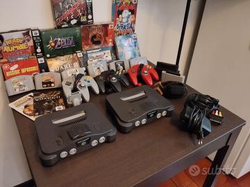 lotto di due console una versione Europe e una versione giapponese con 3 controller,expansion pack,adattatore universali e adattatore per espansione memoria,motorino vibrante,numerosi giochi sia europei che japponesi alcuni anche molto rari e gettonati con relative scatole.
