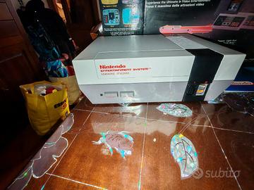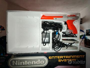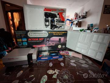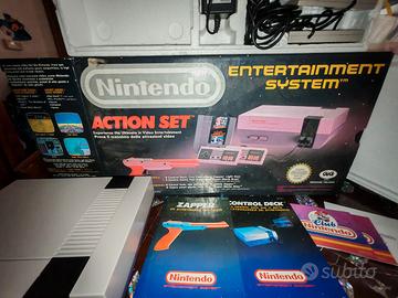 Vendo Nintendo action set originale anni '80 confezione originale con console 2 controller pistola zapper alimentatore e switch per la tv. Gioco non incluso 1 porta mancante (reperibile su internet a basso costo)