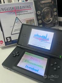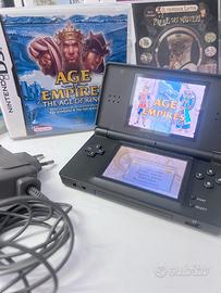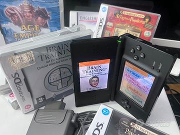 Nintendo DS nero, perfettamente funzionante, completo di accessori, e di 7 giochi: English training - Prof Leyton e lo scrigno di Pandora - Picross - Hotel Dusk Room 215 (giallo) - Age of Empire - Prof Leyton e il paese dei misteri - Brain training - spese di spedizione a parte.