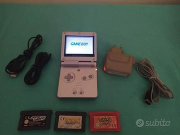 VENDO CONSOLE PORTATILE NINTENDO GAME BOY ADVANCE SP CON 3 CARTUCCE GIOCHI, CAVI DI COLLEGAMENTO PER GIOCO A 2 E CARICABATTERIA ORIGINALE.