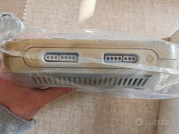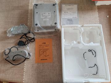 Console perfettamente funzionante con segni di ingiallimento, completa di due controller in ottime condizioni, libretto e box integro un pó scolorito nei bordi. Cavi assenti in quanto in origine non erano venduti insieme alla console