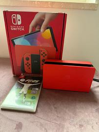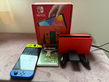 Nintendo Switch con 3 joy-con rosso giallo e blu, compreso nel prezzo ci sono 2 giochi ( fifa 25, Mario jumboree) dal vslore di 70 euro.