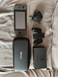 Nintendo switch grigia con scheda micro sd, custodia, controller cavo di ricarica e trasformatore per collegarla alla TV