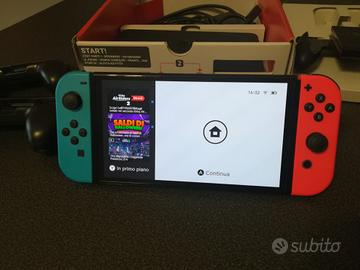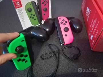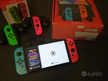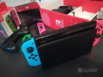 Nintendo Switch Oled in perfette condizioni usata poche volte per controllare il corretto funzionamento, perfettamente funzionante, Joycon aggiuntivi verde e rosa con scatola, controller di plastica per inserire i joycon e agevolare il gioco, la Switch è completa di tutti gli accessori nella sua scatola (come per esempio il caricabatterie, il cavo HDM 1, ecc...).