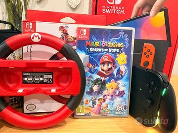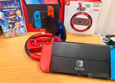 Vendo Nintendo Switch OLED in ottime condizioni, usata poco e perfettamente funzionante. Incluso tutto il necessario originale: ✔️ Dock + cavi originali ✔️ Joy-Con In più regalo accessori: ✔️ Volante di Super Mario ✔️ Gioco Rabbids ✔️ 2 Joy-Con RGB (valore 32€) ✔️ Joypad USB Disponivile a qualsiasi prova