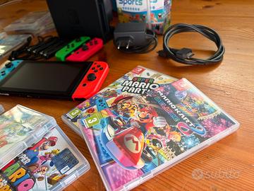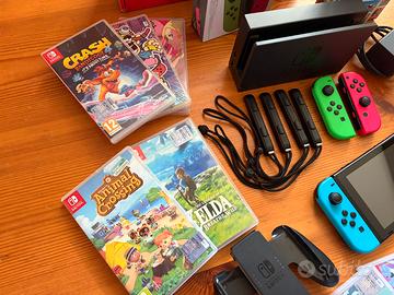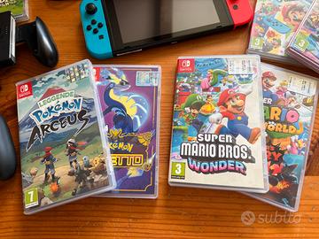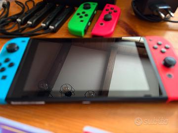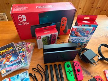 Vendo incredibile pacchetto Nintendo Switch completo e pronto all'uso, perfetto per tutta la famiglia o per giocare fino a 4 persone contemporaneamente. Tutto il contenuto è in ottime condizioni estetico/funzionali, console testata e resettata alle impostazioni di fabbrica. Incluso nella vendita: • Console: Nintendo Switch (Modello V2) Neon Red/Blue, completa di scatola originale. • Accessori: Dock nera per TV, Alimentatore originale, Cavo HDMI, 2x laccetti laccetti neri. • Controlli Extra: Seconda coppia di Joy-Con originali (Neon Green/Neon Pink), completa di scatola originale e laccetti. (In totale 4 Joy-Con). • Impugnature: 2x Joy-Con Grip aggiuntivi (Totale 3 grip inclusi). 12 Giochi in versione fisica (vedi foto, custodia completa): 1.Super Mario Bros. Wonder 2.Mario Kart 8 Deluxe 3.The Legend of Zelda: Breath of the Wild 4.Super Mario 3D World + Bowser's Fury 5.Leggende Pokémon: Arceus 6.Pokémon Violetto 7.Animal Crossing: New Horizons 8.Super Mario Party 9.Nintendo Switch Sports (include fascia per gamba) 10.WarioWare: Get It Together! 11.Catherine: Full Body 12.Crash Bandicoot 4: It’s About Time Un pacchetto unico che include praticamente tutti i "must-have" di Nintendo!