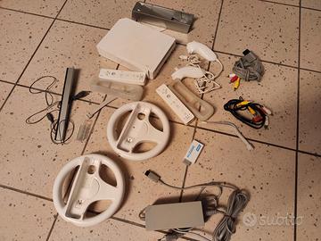 Nintendo Wii Mario Kart big pack perfettamente funzionante, con 2 joypad, 2 volanti, gioco Mario Kart originale e adattatore HDMI, no scatola, unica imperfezione lo sportellino posteriore non si chiude (non si usa mai si chiude con un pezzettino di scotch invisibile).