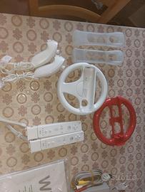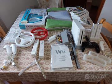 Nintendo Wii usata con 2 controller usati, 1 pad, 1 nunchuk usato, 2 controller poco usati, 2 nunchuk poco usati, 4 gommini protettivi, 2 volanti, 1 kit accessori sport 4 in 1, piattaforma Wii fit plus con il gioco. 12 giochi: avatar il gioco, Wii fit plus, Mario kart Wii, animal crossing, super fruit fall (nuovo mai aperto), Pes 2011, Pes 2012, fifa 13 Smack Down vs Raw 2010, call of duty, Sonic riders zero Gravity, 2 Wii sport.