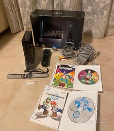 Nintendo Wii funzionante ed in ottime condizioni. Compresa di scatola originale, telecomando con guscio, 2 giochi, cavo di ricarica, cavo TV SCART, barra sensore.
