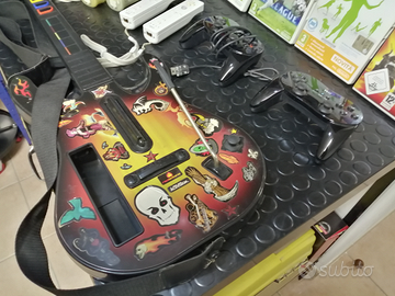Console Nintendo Wii con slot da 2 Gb compresa (con giochi) vari giochi e joystick come da foto.. Chitarra e Balance Board perfettamente funzionanti e in ottimo stato.. Vendo in blocco o separatamente con il gioco dedicato.