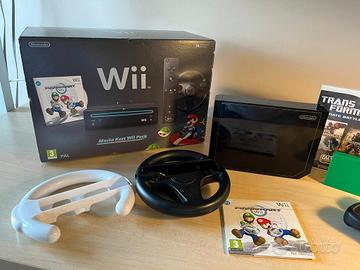 Nintendo wii nera +Mario kart wii+2 wheels+2 nunchuck. Skylanders giants+skylanders. Transformers ultimate batte edition (gioco). Hyper fighters (gioco). Ben 10 omniverse (gioco).