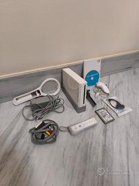 La console è completa di tutti i suoi accessori originali in dotazione, incluso il gioco di Wii Sports e l'accessorio racchetta, tutto visibile in foto.