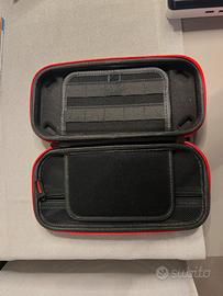 Inoltre si includono tutti gli accessori che si vedono in foto tra cui custodia rigida, stazione di ricarica per controller, secondo controller, joy con grip arancione, joy con strap e altri due adattatori.