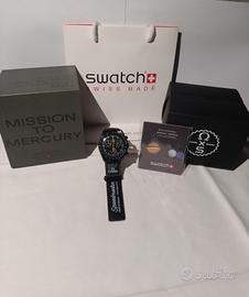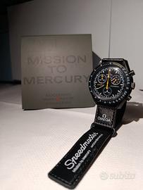 MERCURIO L’Mission to Mercury è un orologio in collaborazione tra Omega e Swatch che celebra il pianeta Mercurio all’interno della serie MoonSwatch ispirata al celebre Speedmaster Moonwatch. È un cronografo al quarzo con cassa in bioceramica dal design moderno e leggero, tipico della collezione. pari all' originale