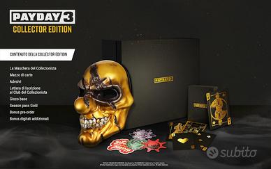 PAYDAY 3 Collector's Edition, Playstation 5 Sigillato La gang più unita di sempre La leggendaria Payday gang, temuta sia dalle forze dell'ordine che dalla criminalità, è finalmente tornata, strappata al suo pacifico ritiro da una minaccia incombente, nata dal caos che il gruppo ha lasciato dietro di sé Dai sfogo alla tua brama Cedi alla tua voglia di fama e ricchezze e scatenati in PAYDAY 3; Oltre all'oro, ai contanti, ai gioielli e a qualsiasi altro oggetto di valore in cui ti imbatterai, potrai sviluppare una notevole collezione di armi, oggetti estetici e riconoscimenti La raffinata arte del furto Un rapinatore professionista sa che ci vogliono pianificazione, duro lavoro e una buona dose di fortuna per portare a termine un colpo con successo; In PAYDAY 3 la scelta è nelle mani del giocatore, che deciderà come affrontare la rapina; Le scelte sono infinite e ognuna di esse cambierà notevolmente gli eventi del gioco; L'unione fa la forza Non tutti sono degni di stare al tuo fianco per qualcosa di così importante come una rapina; Per questo motivo, il modo migliore per vivere l'esperienza di PAYDAY 3 è farlo con gli amici più stretti, sia quelli storici che quelli che incontrerai strada facendo. Contenuto: Il gioco, DLC "The Trifecta Lootbag", DLC "Season Pass" (12 mesi), "The Collector's Mask" (nel gioco), DLC "Collector's Club"*, Maschera da collezionista con supporto, mazzo personalizzato e adesivi