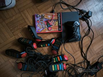 consolle Sony PlayStation 2, funzionante con videogioco Buzz, completa di 8 controller.