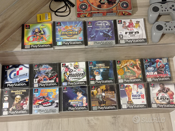 PlayStation 1 originale funzionante con 1 pad originale,2 pad bluetooth,2 pad non originali più vari giochi tutti originali e funzionanti,Memory card e cavi...alcuni giochi non più disponibili come segnato in foto con crocette rosse