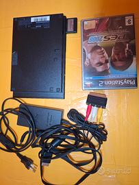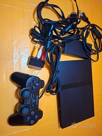 Console PlayStation 2 Slim in color nero, completa di alimentatore, cavi e gioco.