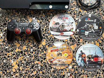 PlayStation 3 con scatola con istruzioni e imballi, cavo hdmi, cavo di alimentazione, un joypad DualShock 3 con cavetto di ricarica. Inclusi 4 giochi come da foto. Tutto testato e funzionante come da foto
