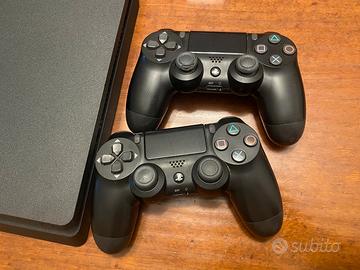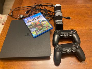 Playstation 4 in ottime condizioni con due controller e tutti i cavi originali. Inoltre sono inclusi un dispositivo per ricaricare due controller contemporaneamente e il gioco Minecraft. Un controller ha la gomma degli analaogici leggermente rovinata.