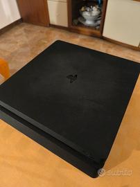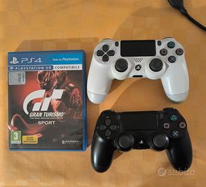 PS4 slim da 1TB usata, perfettamente funzionante, con 2 controller anche essi perfettamente funzionanti, inseme la base di ricarica per i controller, il gioco "Gran Turismo Sport" con la sua scatola originale PS4, con il cavo di alimentazione e HDMI.