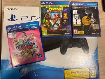 Vendo per inutilizzo PlayStation 4 con scatola originale tenuta in ottime condizioni completa di cavi(hdmi,alimentazione e ricarica controller), 2 controller ps4 originali funzionanti (che presentano minimi difetti) e 3 giochi: