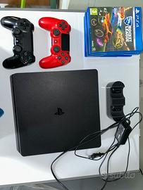 Vendo PS4 slime con due joystick vicino e base di ricarica per i controller