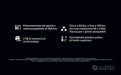 PlayStation Spectral Super Resolution (PSSR) Prestazioni della console ottimizzate Advanced Ray Tracing 2 TB di memoria di archiviazione Gioca a 60 fps, o fino a 120 fps, con una risoluzione 4K e il Ray Tracing per i giochi compatibili Potenziamento dei giochi e retrocompatibilità di PS5 Pro Qualità dell'immagine ottimizzata per i giochi per PS4 Connettività wireless online di livello superiore Unità SSD ad altissima velocità Sistema I/O integrato Supporto per giochi in 8K Fino a 120 fps con output a 120 Hz Frequenza di aggiornamento variabile (VRR) Tecnologia audio 3D Tempest Tecnologia HDR Feedback aptico Grilletti adattivi